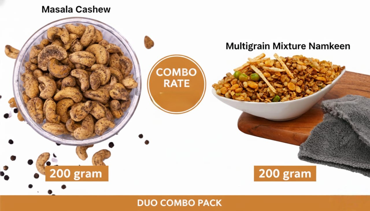 This pairing offers textural variety and nutritional balance: the creamy, spiced richness of the Cashews and the crunchy, traditional flavor of the Namkeen. With both being 100% Roasted, you never have to choose between taste and your health goals.