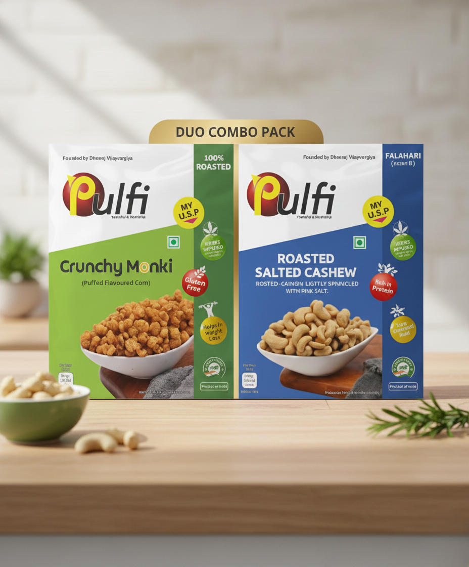 Elevate your snack time with the Pulfl Duo Pack! This powerful combo features the rich, protein-packed Roasted Salted Cashews and the light, uniquely crispy Crunchy Monki (Puffed Flavoured Corn). Both snacks are 100% Roasted, not fried, ensuring you get quality nutrition and authentic flavor without the deep-fried guilt. This duo is the definitive choice for a versatile and effective healthy snack!