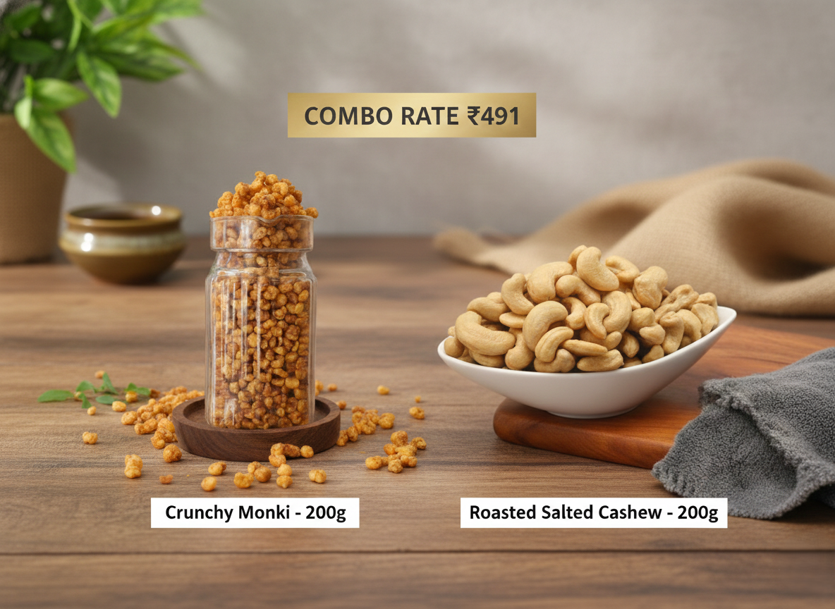 This pairing offers textural variety and nutritional balance: the creamy, filling energy of Roasted Salted Cashews and the light, guilt-free crunch of Crunchy Monki. With both being 100% Roasted, you get the quality you deserve in every healthy snack bite.