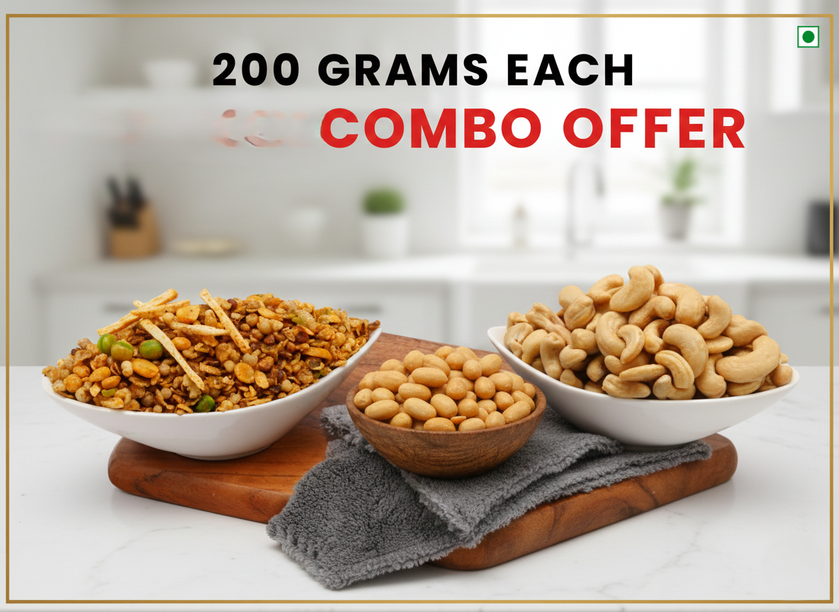 Triple Crunch, Zero Oil: Enjoy three distinct, delicious 100% Roasted snacks—Multigrain Mixture Namkeen, Salted Peanuts, and Roasted Salted Cashew. All are certified oil-free.